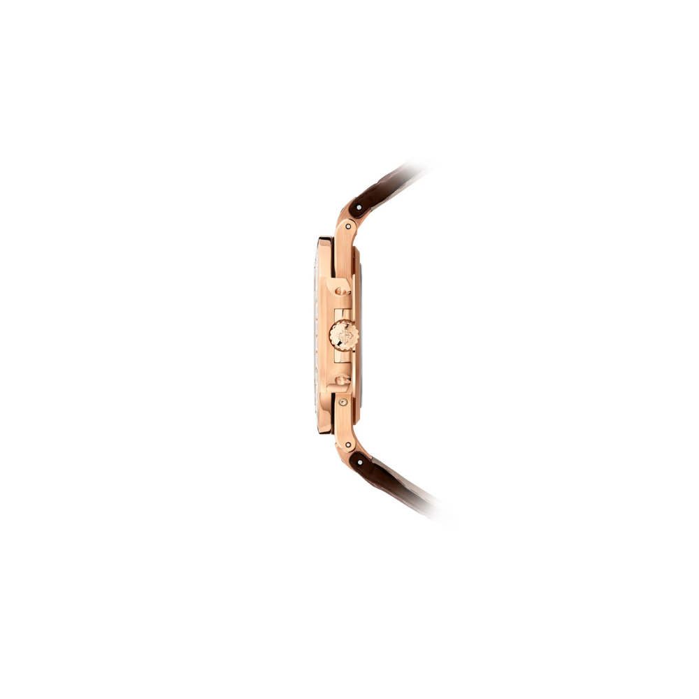Luxurious rose gold case with baguette diamond-set bezel.